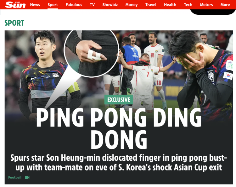 영국의 유명 언론 '더선'은 아시안컵 4강전을 앞두고 손흥민과 이강인 선수 간에 발생한 불화와 이로 인한 손흥민 선수의 부상 소식을 대서특필했습니다. 영국 언론 더선은 출처 불분명한 신빙성 없는 기사를 내복내기로 악명이 높은 언론사입니다. 그러나 사생활 부분에 있어서는 공신력이 있다고 꽤 믿어줄 만한 평을 받고 있는 언론사입니다.