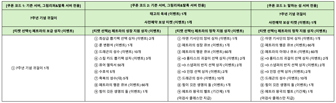 1. 7주년 기념 귀걸이 : 5월 29일부터 사전등록 쿠폰 등록 시 즉시 지급됩니다. 이 귀걸이는 그림리퍼, 발로그 서버를 포함한 기존 서버에서 사용 가능합니다.