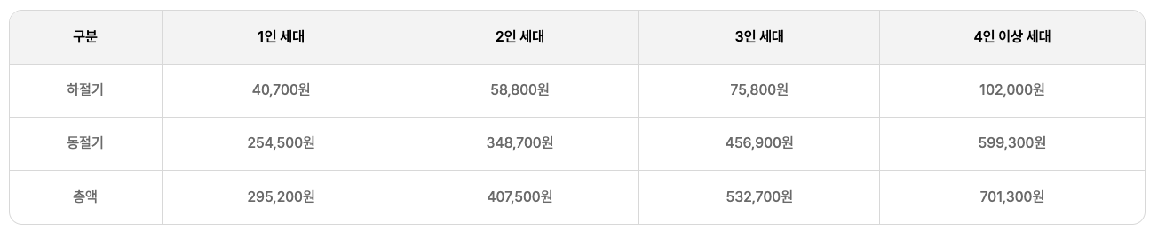 지원 금액은 세대원 수를 고려하여 세대당 금액을 차등하여 지급합니다. 세대원 수는 등본에 포함된 세대원으로 산정하며 에너지바우처의 지원금액은 소득산정을 반영하지 않습니다. (대상자로 확인되면 세대 수만 고려하며 지급)