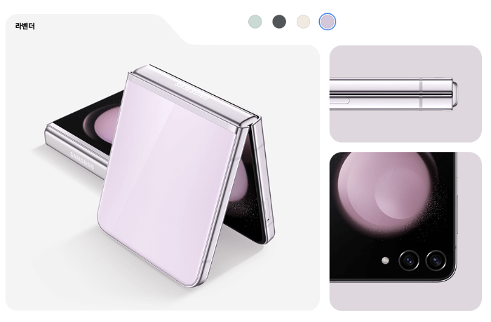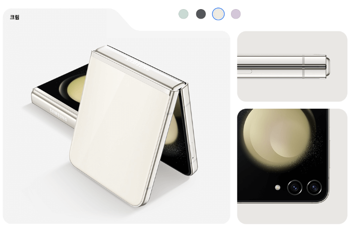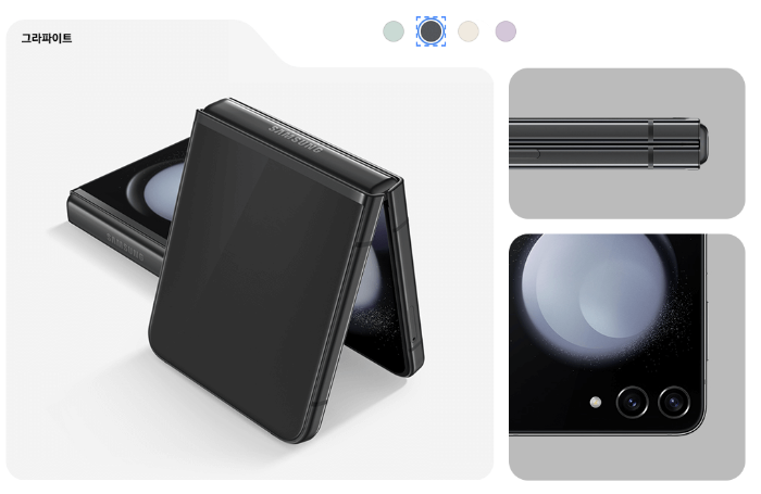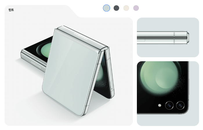 갤럭시 z플립5 스펙의 변화 두 번째는 컬러입니다. 전작에 비해 다양한 컬러가 출시되었습니다. 민트, 그라파이트, 크림, 라벤더 이렇게 4가지 색상과 더불어 온라인 전용 색상인 그레이, 블루, 그린, 옐로우 4가지 컬러까지 더해 총 8개의 색상으로 출시될 예정이라고 합니다. 아래 사진으로 4가지 컬러를 확인해 보세요. 삼성닷컴 전용색상은 보러 가기를 누르시면 삼성전자 홈페이지로 이동합니다.