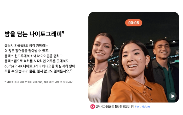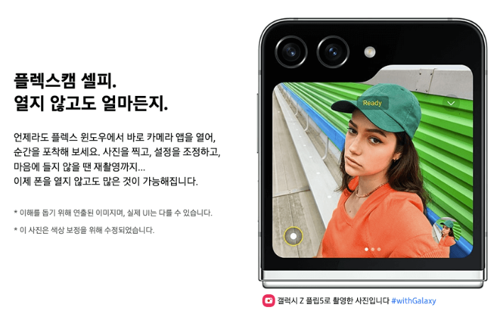 갤럭시 z플립5 스펙 중 카메라 부분은 플립4와 동일한 하드웨어가 탑재되었다고 합니다. 다만, 플립 4보다는 스냅드래곤 프로세서와 isp가 바뀌면서 최적화 부분이 달라졌습니다.